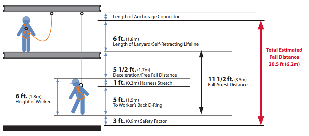 Before using a shock absorbing lanyard or self-retracting lifeline (SRL), it is crucial to calculate fall distances and select the proper equipment so as to meet estimated fall clearance. Failure to do so may result in serious personal injury, paralysis or death.